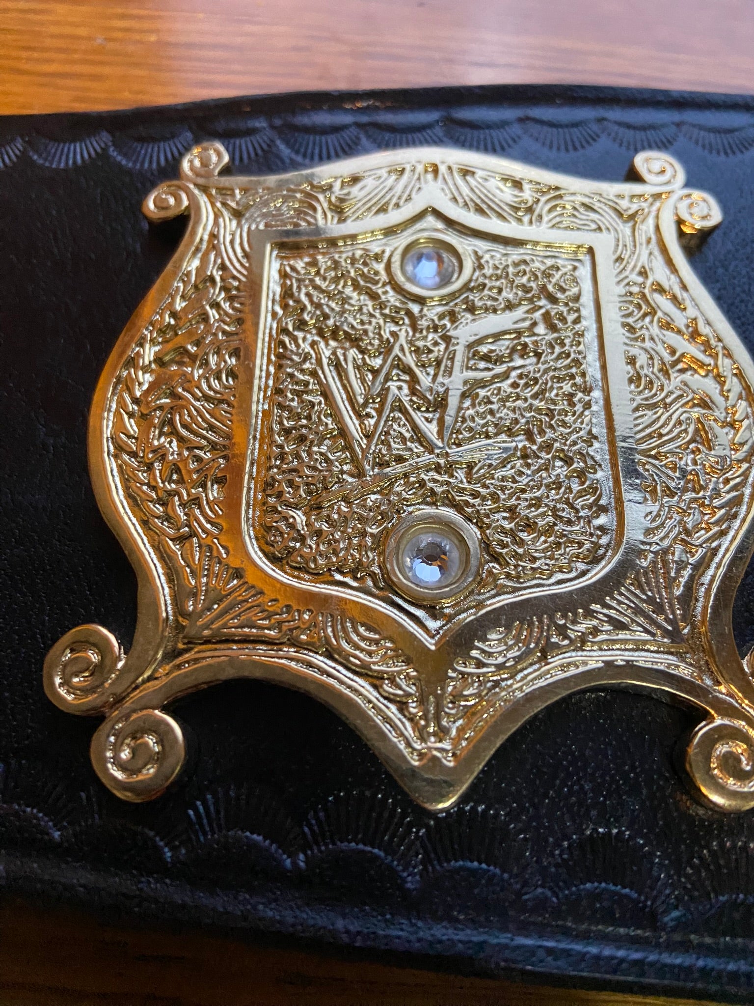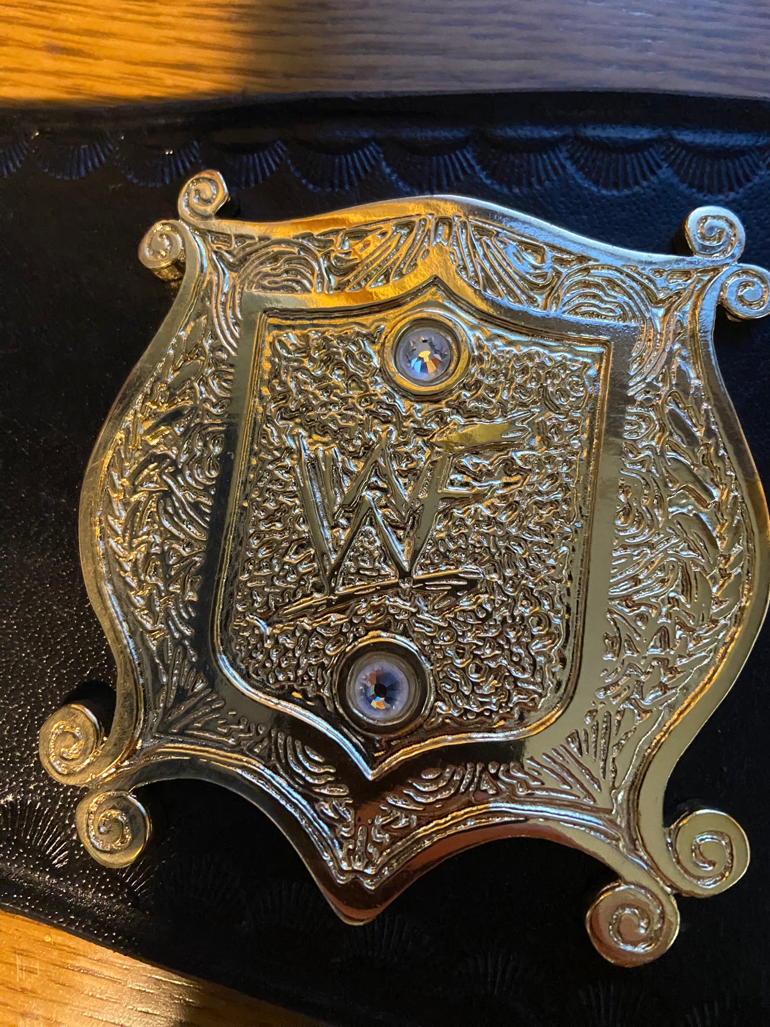 Following the company's rebranding to WWE in May 2002, the logo and wording were updated accordingly. The belt also included a nameplate for the reigning champion and side plates adorned with the McMahon family crest—a lion holding a shield featuring the company logo.