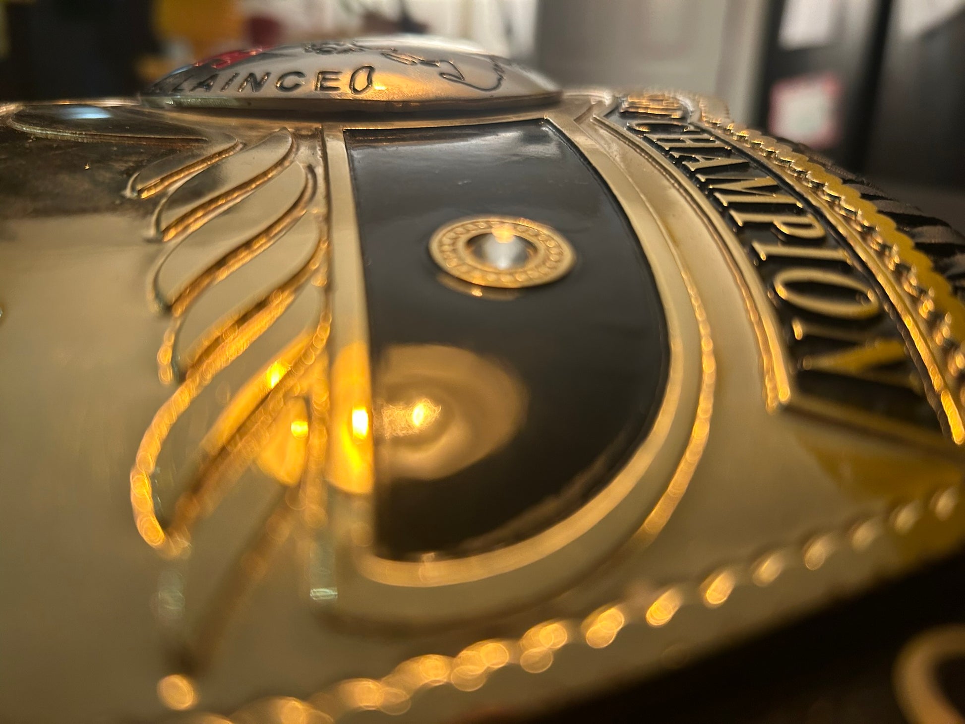 The most iconic version of the belt, introduced in 1973 and still used today, features a domed, rounded rectangular central plate made of polished gold with a distinctive circular globe at the centre. Above the globe is the inscription “NWA,” and below it reads “World’s Heavyweight Champion.” -