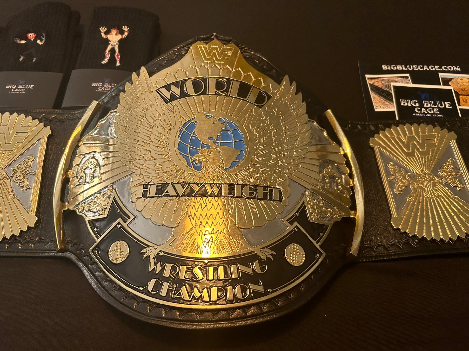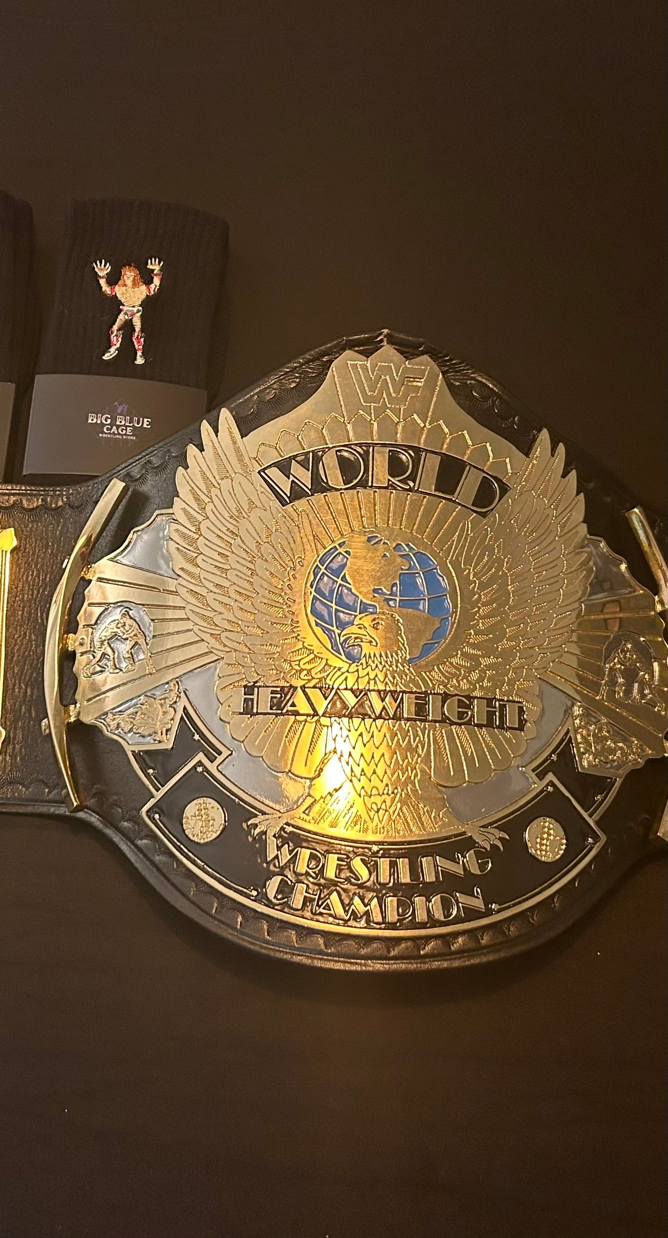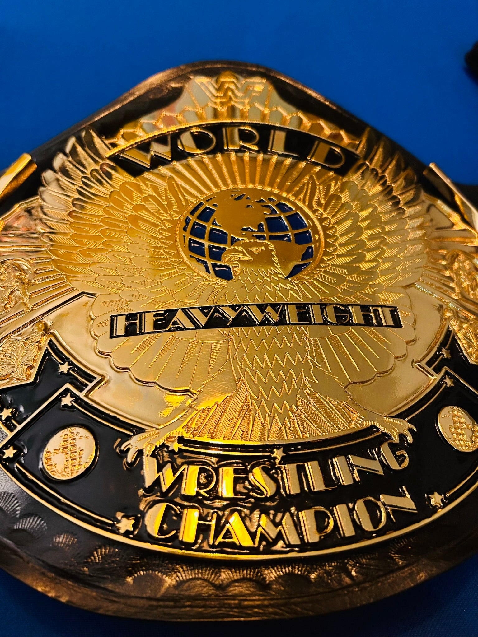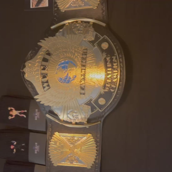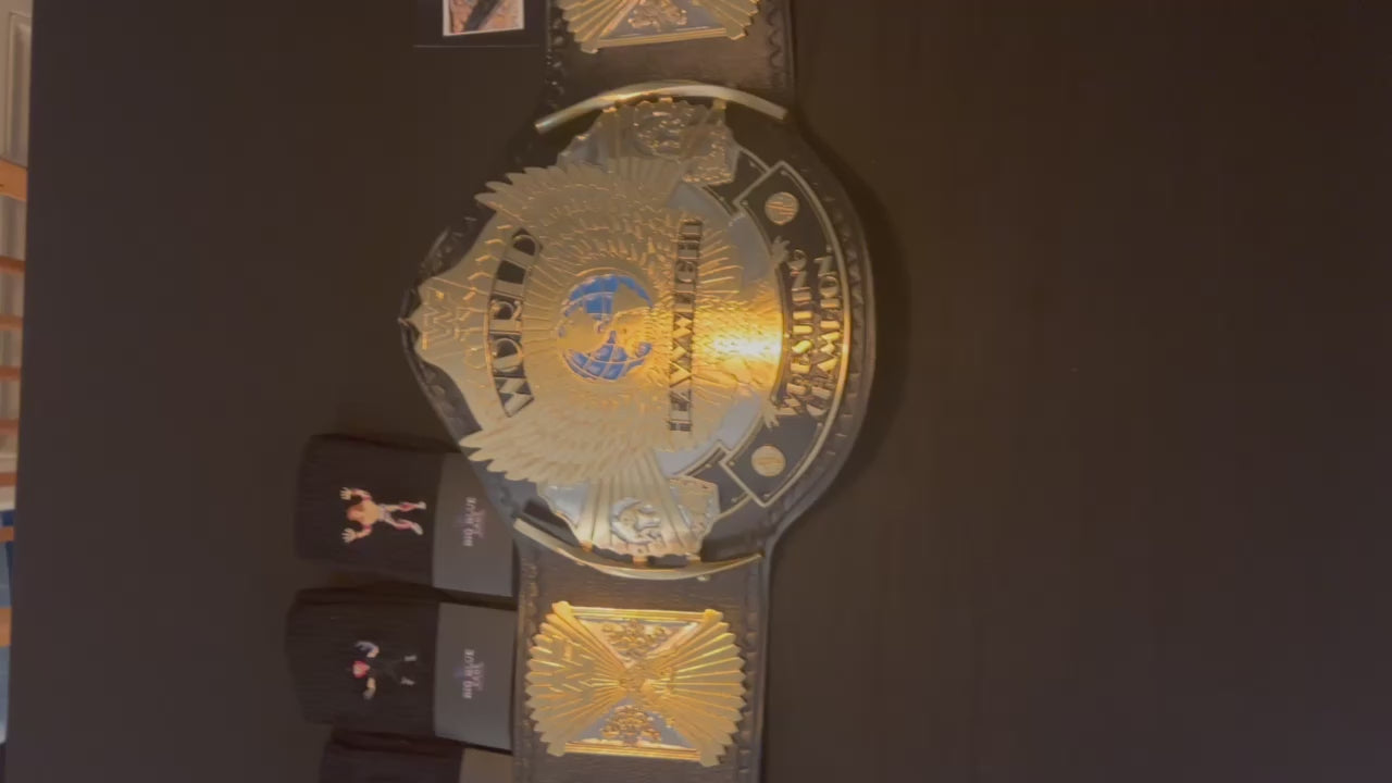 The Winged Eagle championship belt, introduced by the WWF (now WWE) in February 1988, is one of the most iconic and beloved designs in professional wrestling history. Its name comes from the prominent eagle with outstretched wings that appears to soar from the center plate, symbolizing prestige and global reach. The belt features the classic WWF block logo.