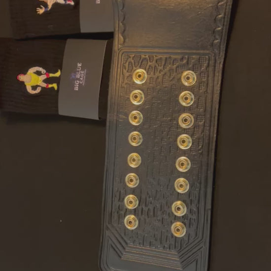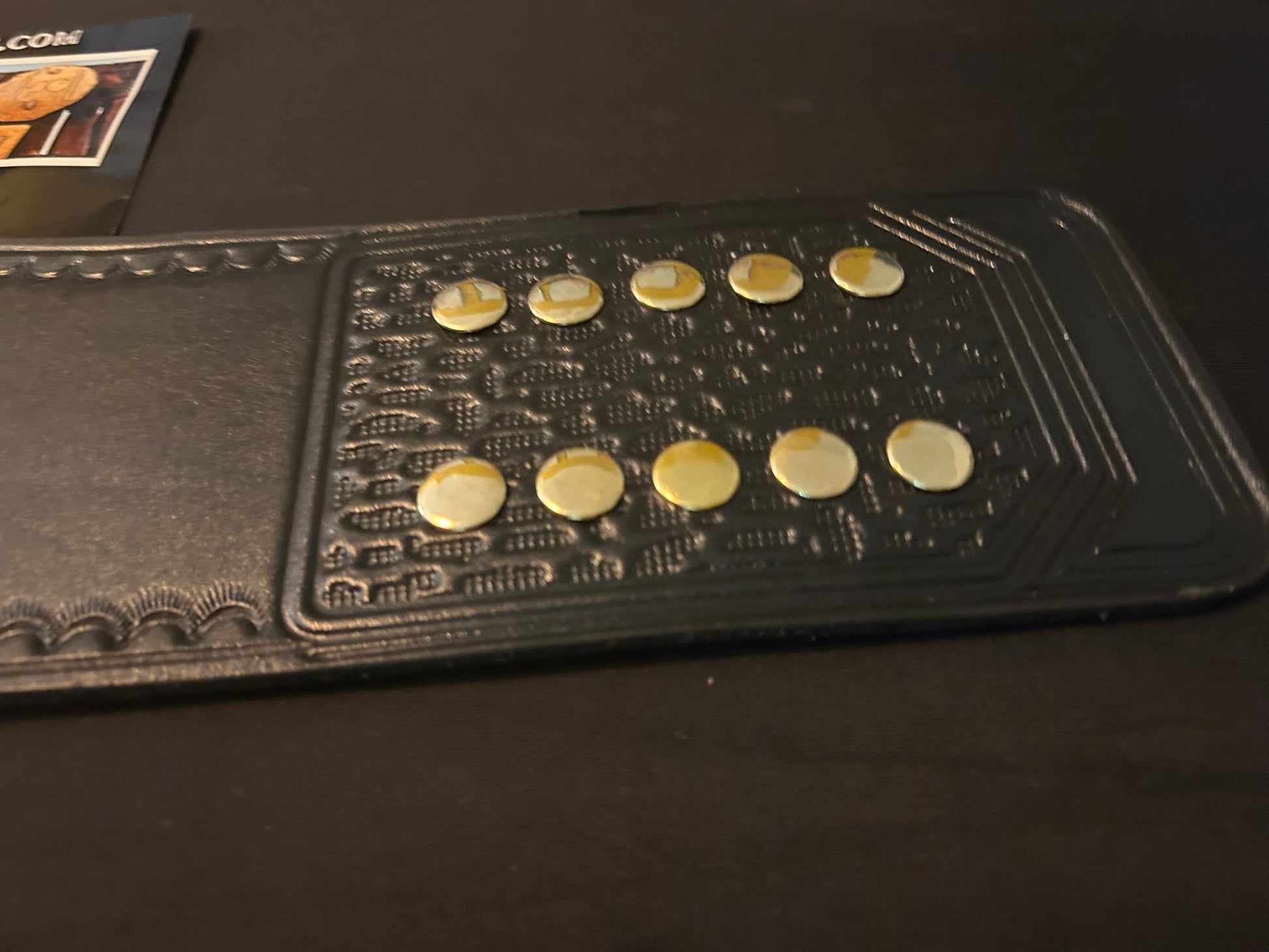 Hand etched onto 4mm thick, zinc plates. Electroplated in 24kt gold and mounted to a hand-tooled genuine leather strap.